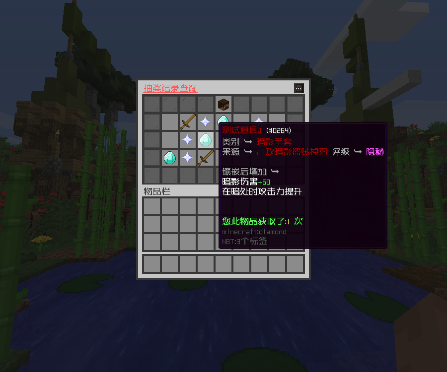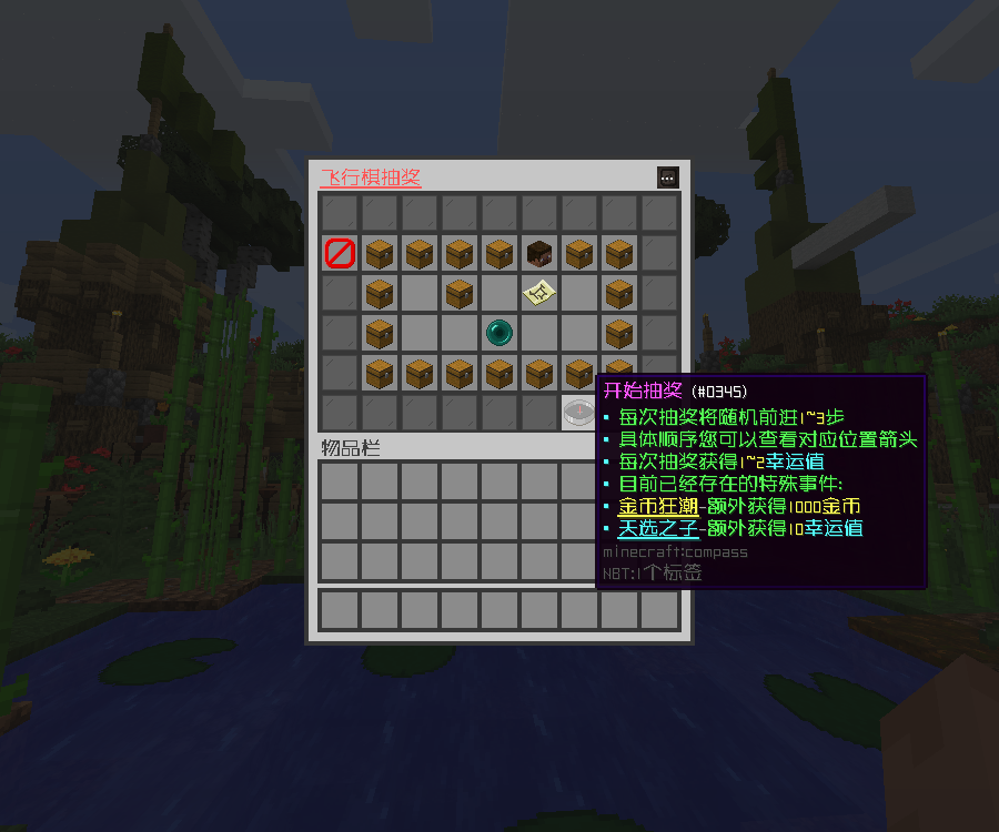 玩家从起点出发,通过消耗材料或点数点击前进 1~3 步(可配置),到达对应槽位后可领取奖励,记录将保存至抽奖历史 GUI。支持手动重置、查看记录、使用幸运值获取保底奖励。