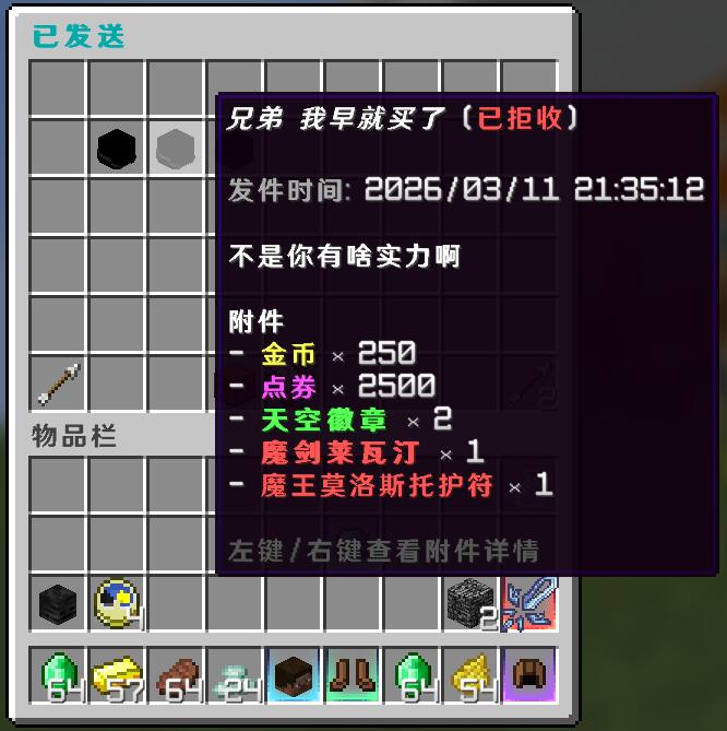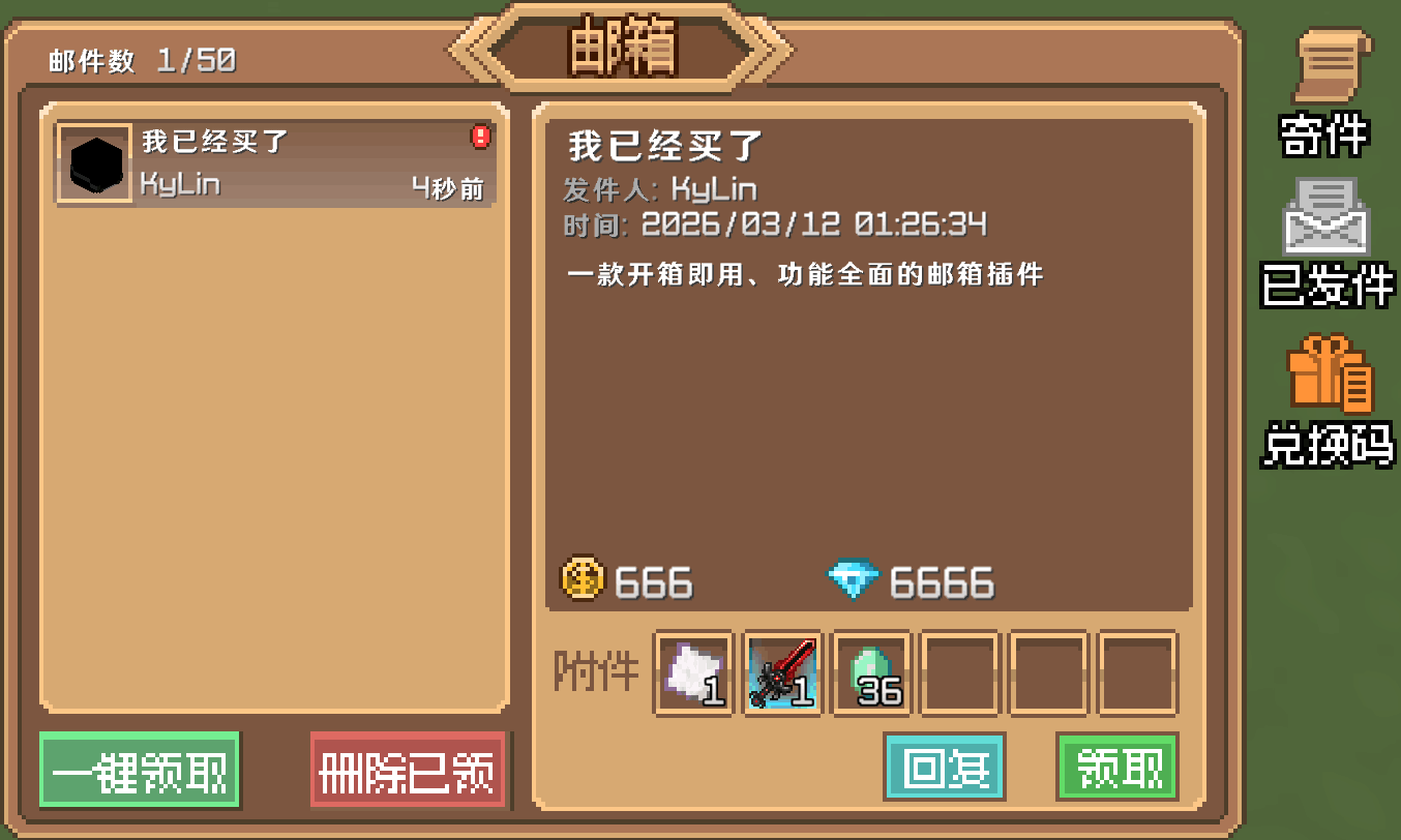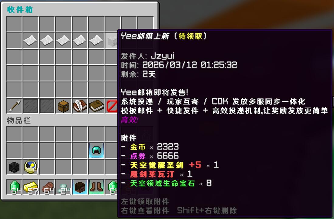 一款开箱即用、功能全面的邮箱插件,支持系统投递、玩家互寄、CDK 发放和多服同步,高效投递系统让奖励投递更简单、更省心